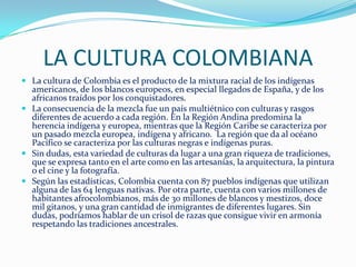 El documento describe la rica diversidad cultural y geográfica de Colombia, destacando la influencia de las mezclas raciales de indígenas, europeas y africanas en diferentes regiones. Se dividen las regiones naturales del país en Amazonía, Andina, Caribe, Insular, Orinoquía y Pacífico, cada una con características únicas y contribuciones a la biodiversidad y economía. Además, se menciona la presencia de una gran variedad de grupos étnicos y su coexistencia dentro de un crisol de culturas.