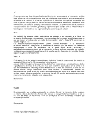 El documento trata sobre diversos temas relacionados con las tecnologías de la información y la comunicación (TIC). Define TIC como tecnologías de la información y también como la preparación de estudiantes para satisfacer necesidades tecnológicas. Explica que las NTIC son un conjunto de aparatos, redes y servicios interconectados que comparten información. Finalmente, describe brevemente la Web 2.0 como una evolución hacia aplicaciones dinámicas donde la colaboración de usuarios es clave.