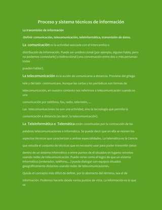 El documento describe la evolución histórica de la comunicación desde los sonidos producidos por humanos y animales hasta las modernas redes de telecomunicaciones digitales. Explica los conceptos clave de comunicación, telecomunicación, teleinformática y transmisión de datos, así como los componentes y modelos de sistemas de comunicación, incluyendo el modelo de Shannon. También compara comunicaciones analógicas y digitales.