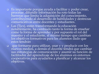 Las tecnologías de la información y la comunicación (TIC) están transformando la educación al facilitar el acceso a la información y romper barreras, cambiando la forma de enseñar y aprender. Esto requiere que los estudiantes aprendan a utilizar y producir con nuevos medios, y que los docentes adopten un rol de facilitadores del aprendizaje en entornos cooperativos. Las TIC ofrecen recursos como entornos virtuales y redes sociales que promueven la creatividad, la innovación y el aprendizaje significativo y flexible