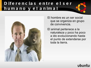 Este documento presenta las diferencias entre los seres humanos y los animales, destacando que los humanos son seres sociales que viven en grupos, mientras que los animales pertenecen a la naturaleza. Luego describe los tres rasgos de la personalidad humana: la dimensión física (herencia genética), la dimensión emotiva (comportamiento ante situaciones) y la dimensión moral (criterios de guía). También explica las condiciones para el desarrollo humano como la dignidad, igualdad y libertad, definiendo esta última