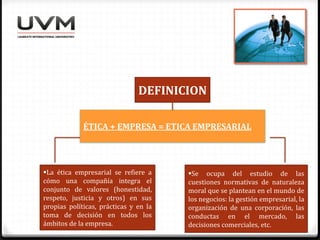 Este documento describe los principios fundamentales de la ética empresarial. Explica que la ética empresarial integra valores como la honestidad y el respeto en las políticas y decisiones de una empresa. Los principios clave incluyen la justicia, la verdad, el respeto y la responsabilidad. También destaca que la ética empresarial puede traer ventajas competitivas como mejor desempeño financiero, mayor lealtad de los empleados y una mejor reputación.