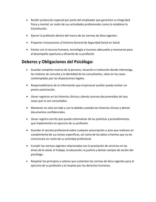 El documento describe las normas, leyes y deberes éticos de los psicólogos en Colombia, Venezuela y el Perú. En Colombia, solo pueden ejercer la psicología aquellos con título universitario reconocido. En Venezuela y el Perú, está prohibido para los psicólogos dar informes sesgados o aceptar beneficios indebidos. Todos deben mantener la confidencialidad y respetar los derechos de los clientes.