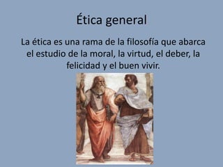 Este documento presenta una introducción a la ética general. En 3 oraciones resume que la ética estudia la moral, la virtud y el deber; se ocupa de los actos humanos voluntarios que dependen de la razón y libertad; y analiza qué es moralmente correcto y cómo aplicar principios morales.