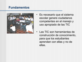 Este documento describe la integración de las Tecnologías de la Información y Comunicación (TIC) en la enseñanza en el Instituto Nuestra Señora de la Asunción (INSA). Se busca que los estudiantes aprendan a usar las TIC como herramientas de aprendizaje y que los maestros las utilicen para enriquecer la enseñanza. El INSA implementa esta integración a través de dos estrategias: un laboratorio de informática y uno de integración, donde los estudiantes desarrollan habilidades TIC y