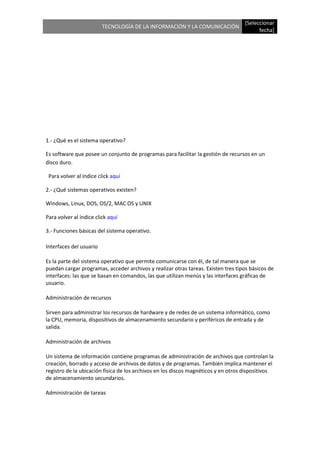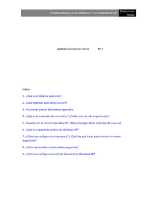 El documento proporciona una guía sobre los sistemas operativos y Windows XP. Explica lo que es un sistema operativo y algunos ejemplos comunes. Detalla funciones básicas como interfaces de usuario, administración de recursos y tareas. Incluye información sobre usuarios en Windows XP, el panel de control, configuración de impresoras, instalación de programas y configuración de redes locales.
