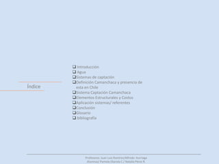 Este documento describe sistemas de captación de agua de camanchaca y su aplicación. Explica que la camanchaca es una neblina costera que se presenta en el norte de Chile y Perú, y que puede captarse para obtener agua dulce. Detalla los elementos estructurales y costos de los sistemas de captación, así como ejemplos de su aplicación como el proyecto Oasis Sustentable en Alto Patache, Chile.