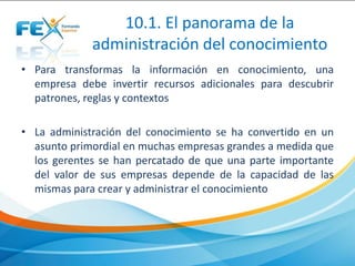 El documento describe diferentes sistemas y técnicas para la administración del conocimiento en las organizaciones. Explica que existen tres principales categorías de sistemas de administración del conocimiento a nivel empresarial: sistemas de conocimiento estructurado, sistemas de conocimiento semiestructurado y sistemas de redes de conocimiento. También describe técnicas inteligentes como sistemas expertos, razonamiento basado en casos y redes neuronales que pueden usarse para capturar y aplicar conocimiento tácito e incrementar la base de conocimiento de una