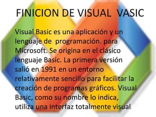 Visual Basic es un lenguaje de programación y aplicación desarrollado originalmente por Microsoft para crear programas gráficos de manera visual. El documento explica que Visual Basic se originó del lenguaje Basic y utiliza una interfaz completamente visual. También describe el uso de arreglos unidimensionales y multidimensionales en Visual Basic para almacenar y manipular datos de manera ordenada.