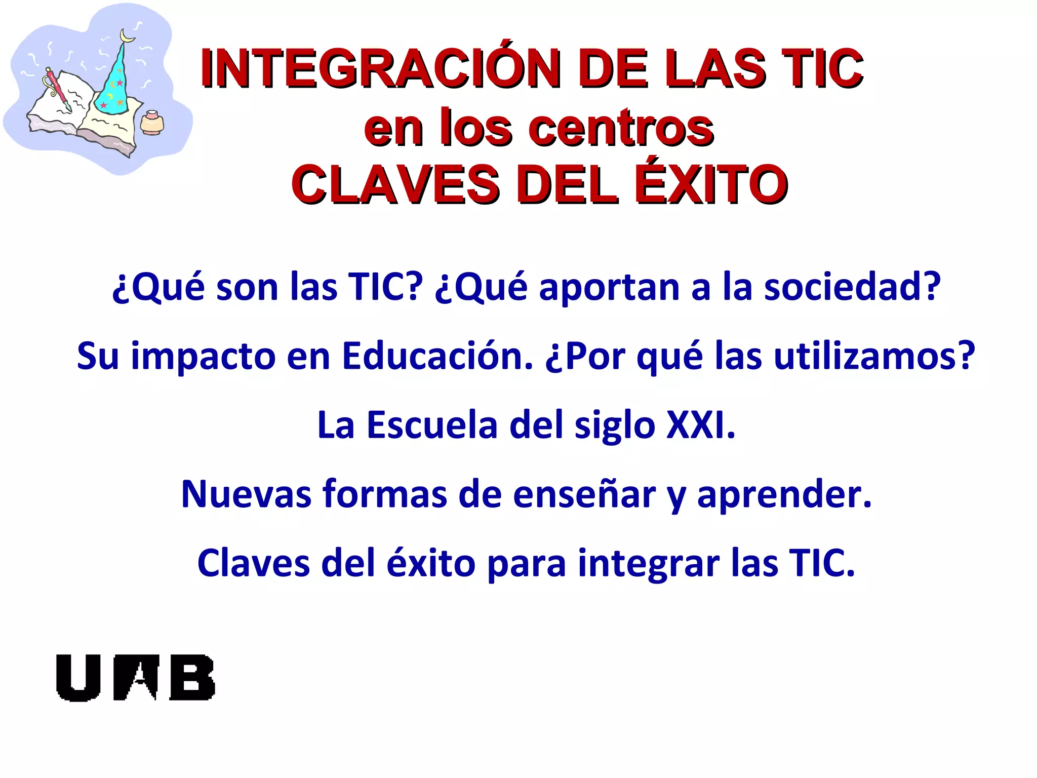 Este documento describe las tecnologías de la información y la comunicación (TIC) y su impacto en la educación. Explica que las TIC aportan nuevas formas de enseñar y aprender en la escuela del siglo XXI, centrada en el estudiante y el aprendizaje colaborativo. También destaca algunas claves del éxito para integrar las TIC de forma efectiva en los centros educativos, como la formación del profesorado, el uso de recursos útiles y la coordinación.