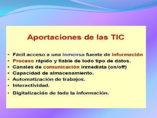 Este documento describe brevemente la evolución de las tecnologías de la información y la comunicación (TIC) a través de las décadas desde 1960 hasta la actualidad. En los años 60 y 70, las computadoras comenzaron a usarse en las escuelas de Estados Unidos y España principalmente para tareas administrativas. En los 80s surgieron las primeras computadoras personales y se desarrollaron software educativos. En los 90s aparecieron las computadoras multimedia y el boom del uso de Internet en educación. Hoy en día, las TIC se incorporan cada vez más