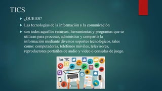 Este documento resume las tecnologías de la información y la comunicación (TIC) y las aulas virtuales. Explica que las TIC incluyen recursos como computadoras, teléfonos, televisores y consolas de juego que se usan para procesar y compartir información. El objetivo es lograr innovación en las prácticas pedagógicas aplicando las TIC para desarrollar habilidades cognitivas en los estudiantes. Se discuten también los tipos de TIC, su inserción en la educación, plataformas educativas y nuevos