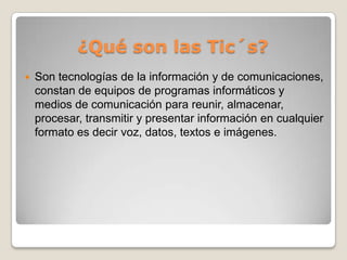 Las TIC's son tecnologías de la información y comunicación que constan de equipos, programas informáticos y medios de comunicación para reunir, almacenar, procesar, transmitir y presentar información en cualquier formato como voz, datos, textos e imágenes. El procesador permite el procesamiento de información y es el cerebro del ordenador.