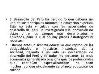 El documento discute el uso de las TIC en la educación en el Perú y la región de Tacna. Argumenta que las TIC pueden mejorar la educación al facilitar el aprendizaje interactivo y la educación a distancia. Sin embargo, existen desafíos como la falta de acceso a Internet confiable, equipos de computación actualizados y capacitación para los maestros. El gobierno regional de Tacna promueve el uso de las TIC en la educación con el apoyo de la UNESCO para desarrollar contenidos pedagógicos interactivos y for