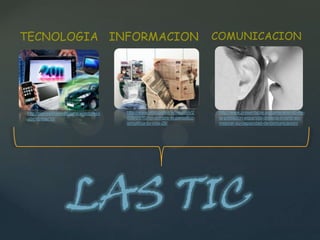 Este documento trata sobre las Tecnologías de la Información y la Comunicación (TICs). Explica que las TICs optimizan e informan sobre diversos ámbitos de la experiencia humana como la educación, la comunicación y el aprendizaje. También genera cambios en aspectos económicos, sociales y culturales a través de la obsolescencia de conocimientos y la emergencia de nuevos valores. Por último, concluye que las TICs son técnicas innovadoras que permiten aprender y enseñar aplicando la tecnolog