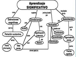 El documento distingue cuatro amplios modelos de aprendizaje: conductistas, de interacción social, personales y de procesamiento de la información. Explica que el aprendizaje implica desarrollar estructuras cognitivas significativas a través de procesos como la asimilación, reflexión e interiorización, y desarrolla actitudes como la crítica y toma de decisiones. También describe tres tipos de aprendizaje: de representaciones, conceptos y proposiciones.