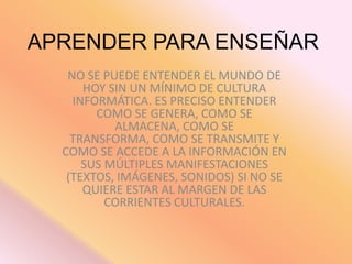 El primer párrafo explica que la tecnología es fundamental para entender el mundo actual y que es necesario comprender cómo se genera, almacena, transforma, transmite y accede a la información. El segundo párrafo destaca que lo más importante sobre la tecnología en las escuelas es cómo llega a los estudiantes, no solo tener laboratorios o profesores capacitados, sino integrarla en las actividades diarias del aula.