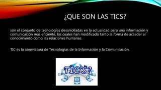 Las TIC son el conjunto de tecnologías para la información y comunicación que han modificado la forma de acceder al conocimiento y las relaciones humanas. Algunas características clave de las TIC incluyen que penetran todos los campos de la vida a través de redes, equipos y servicios digitales, y que permiten el acceso a información de forma instantánea e interactiva. Las TIC tienen ventajas como facilitar el acceso a información y promover nuevas formas de pensamiento, pero también desventajas como la dispersión de información y el riesgo a