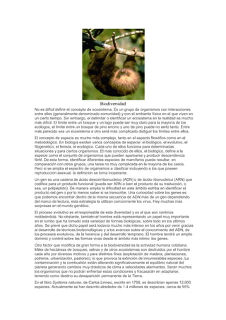 La biodiversidad se refiere a la gran variedad de formas de vida en la Tierra, incluidos ecosistemas, especies y material genético. La diversidad biológica es fundamental para el equilibrio de los ecosistemas y la regulación ambiental, pero está disminuyendo debido a la acción humana como la contaminación y la destrucción de hábitats. La conservación de la biodiversidad es crucial para el desarrollo sostenible y la supervivencia de la humanidad.