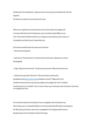 (1) El documento proporciona instrucciones sobre cómo acceder a Internet Explorer si no está disponible en el escritorio o barra de tareas y explica que la página de inicio predeterminada es MSN.