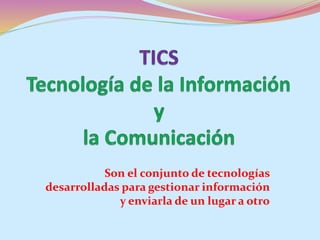 Las tecnologías de la comunicación y la información son el conjunto de tecnologías desarrolladas para gestionar y transmitir información. Son una actividad social centrada en un saber hacer organizado y creativo cuya integración en la educación implica comprender sus posibilidades y limitaciones. Las TIC se utilizan en diversos sectores como educación, administración pública y salud, dando respuesta a necesidades sociales a través de conocimientos complejos asociados a la ciencia y la técnica.