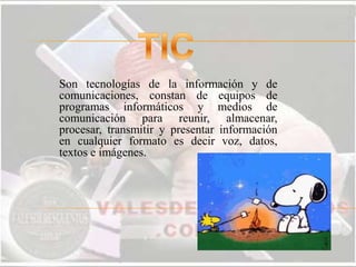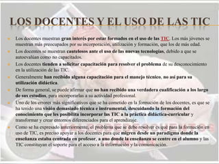 Las tecnologías de la información y comunicación (TIC) permiten reunir, almacenar, procesar, transmitir e intercambiar información en cualquier formato. Los docentes muestran interés en capacitarse en el uso de las TIC, aunque los más jóvenes están más interesados que los mayores. Generalmente han recibido capacitación técnica pero no en su aplicación didáctica. Se necesita apoyar a los docentes para que transiten hacia un enfoque centrado en el estudiante donde las TIC apoyen el acceso a la inform