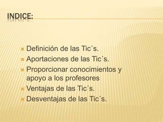 Este documento define las Tecnologías de la Información y la Comunicación (TIC) como tecnologías que gestionan y transforman la información a través de sonido e imágenes para configurar la sociedad de la información y motivar a los estudiantes. Las TIC brindan acceso a grandes cantidades de información, procesan datos de forma rápida y fiable, permiten el almacenamiento digital y la comunicación inmediata. Si bien las TIC aumentan la información disponible y permiten el aprendizaje autónomo y colaborativo, también