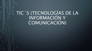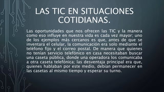 Las TIC como la telefonía celular, internet y correo electrónico ahora juegan un papel fundamental en la vida cotidiana al facilitar la comunicación y el acceso a la información. Antes, la comunicación era más lenta y costosa a través de casetas telefónicas y correo postal. Ahora, las TIC se usan ampliamente en situaciones escolares, laborales, personales y sociales para mantener contacto con otros de manera más rápida y a bajo costo sin importar la distancia.