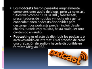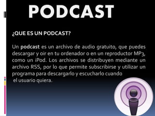 Un podcast es un archivo de audio gratuito que se puede descargar y escuchar en cualquier momento y lugar a través de un ordenador o reproductor MP3. Los podcasts se distribuyen mediante archivos RSS que permiten a los usuarios suscribirse y descargar automáticamente nuevos episodios. Los podcasts pueden incluir charlas, tutoriales, música u otro tipo de contenido y sirven para compartir grabaciones originales de audio o video o emisiones de radio y televisión.