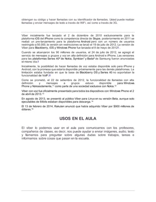 Viber es una aplicación gratuita que permite a los usuarios hacer llamadas y enviar mensajes de texto a otros usuarios de Viber a través de WiFi o 3G. Viber funciona en la mayoría de los teléfonos inteligentes y sistemas operativos móviles como Android, iPhone, Blackberry y Windows Phone. Los usuarios pueden comunicarse gratis entre sí a través de Viber o realizar llamadas de bajo costo a números fijos y móviles a través de ViberOut.