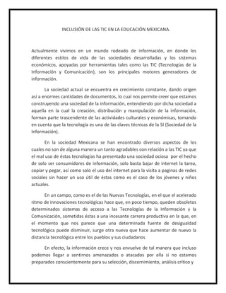 -451485-271145<br />UNIVERSIDAD NACIONAL AUTÓNOMA DE MÉXICO<br />FACULTAD DE ESTUDIOS SUPERIORES ACATLÁN<br />NUEVAS TECNOLOGÍAS EDUCATIVAS.<br />PEDAGOGÍA<br />Grupo: 1504<br />LÓPEZ PÉREZ ANA LUCÍA<br />06-SEP-2010<br /> <br />                           Inclusión de las TIC en la educación mexicana.<br />Actualmente vivimos en un mundo rodeado de información, en donde los diferentes estilos de vida de las sociedades desarrolladas y los sistemas económicos, apoyadas por herramientas tales como las TIC (Tecnologías de la Información y Comunicación), son los principales motores generadores de información. <br />La sociedad actual se encuentra en crecimiento constante, dando origen así a enormes cantidades de documentos, lo cual nos permite creer que estamos construyendo una sociedad de la información, entendiendo por dicha sociedad a aquella en la cual la creación, distribución y manipulación de la información, forman parte trascendente de las actividades culturales y económicas, tomando en cuenta que la tecnología es una de las claves técnicas de la SI (Sociedad de la Información).<br />En la sociedad Mexicana se han encontrado diversos aspectos de los cuales no son de alguna manera un tanto agradables con relación a las TIC ya que el mal uso de éstas tecnologías ha presentado una sociedad ociosa  por el hecho de solo ser consumidores de información, solo basta bajar de internet la tarea, copiar y pegar, así como solo el uso del internet para la visita a paginas de redes sociales sin hacer un uso útil de éstas como es el caso de los jóvenes y niños actuales.<br />En un campo, como es el de las Nuevas Tecnologías, en el que el acelerado ritmo de innovaciones tecnológicas hace que, en poco tiempo, queden obsoletos determinados sistemas de acceso a las Tecnologías de la Información y la Comunicación, sometidas éstas a una incesante carrera productiva en la que, en el momento que nos parece que una determinada fuente de desigualdad tecnológica puede disminuir, surge otra nueva que hace aumentar de nuevo la distancia tecnológica entre los pueblos y sus ciudadanos<br />En efecto, la información crece y nos envuelve de tal manera que incluso podemos llegar a sentirnos amenazados o atacados por ella si no estamos preparados conscientemente para su selección, discernimiento, análisis crítico y <br />Transformación en conocimiento de aquello que nos interese para conducir nuestras vidas como sujetos autónomos. <br />Muchos de estos problemas se deben a que la sociedad Mexicana no está informada acerca de las herramientas que nos frece la web y por eso es que la sociedad no está de alguna manera actualizada en este tema. Es importante también recalcar que la economía de nuestro país no es muy favorable al igual que la administración de ésta, así como los programas no son los adecuados para aplicarlos o por diversas circunstancias que hacen que nos atrasemos en  el ámbito de las TIC.<br /> En la sociedad de la Información moderna nos encontramos que surge un nuevo tipo de organización que es la tecnócrata, vista como una elite dominante que se refiere a la consideración de que la cultura de unos pocos no dependerá del trabajo de muchos. Esto es, que las sociedades más avanzadas tienen en común un crecimiento tecnológico para la valoración y gestión de la información, que les permite abordar de forma precisa temas técnicos, económicos y sociales, lo que les lleva al aumento de productividad y desarrollo.<br />Esto nos lleva a comprender que las nuevas tecnologías y su buen uso nos llevan al mejoramiento de nuestra propia sociedad y que además de esto nos conlleva a la mejora de nuestros conocimientos.<br />Por otra parte, Reconocemos que la educación, el conocimiento, la información y la comunicación son esenciales para el progreso, la iniciativa y el bienestar de los seres humanos. Es más, las tecnologías de la información y las comunicaciones (TIC) tienen inmensas repercusiones en prácticamente todos los aspectos de nuestras vidas. El rápido progreso de estas tecnologías brinda oportunidades sin precedentes para alcanzar niveles más elevados de desarrollo.<br />La capacidad de las TIC para reducir muchos obstáculos tradicionales, especialmente el tiempo y la distancia, posibilitan, por primera vez en la historia, el uso del potencial de estas tecnologías en beneficio de millones de personas en todo el mundo. Somos conscientes de que las TIC deben considerarse un medio, y no un fin en sí mismas. <br />En condiciones favorables, estas tecnologías pueden ser un instrumento eficaz para acrecentar la productividad, generar crecimiento económico, crear empleos y fomentar la ocupabilidad, así como mejorar la calidad de la vida de todos. Pueden, además, promover el diálogo entre las personas, las naciones y las civilizaciones. <br />                  <br />                        <br />