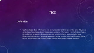 Este documento define las tecnologías de la información y la comunicación (TIC), el comercio electrónico (e-commerce) y cómo las TIC se aplican al sector bancario. Explica los aspectos positivos y negativos de las TIC para los negocios y el comercio, como la agilización de compras y pagos en línea pero también los riesgos de fraude. Finalmente, concluye que las TIC facilitan las transacciones diarias pero requieren precaución al usar sistemas electrónicos para negocios.