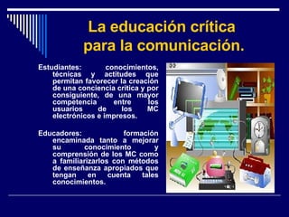El documento aborda la importancia de la educación en medios de comunicación en un contexto globalizado, enfatizando la necesidad de desarrollar competencias críticas entre los estudiantes y proporcionar formación adecuada a los educadores. Destaca que la alfabetización mediática y el uso de nuevas tecnologías son esenciales para la cultura democrática y crítica. Además, plantea la urgencia de un enfoque intermedio frente a las corrientes de tecnofobia y tecnofilia, promoviendo un currículo que forme a los alumnos como consumidores críticos y productores de contenido.