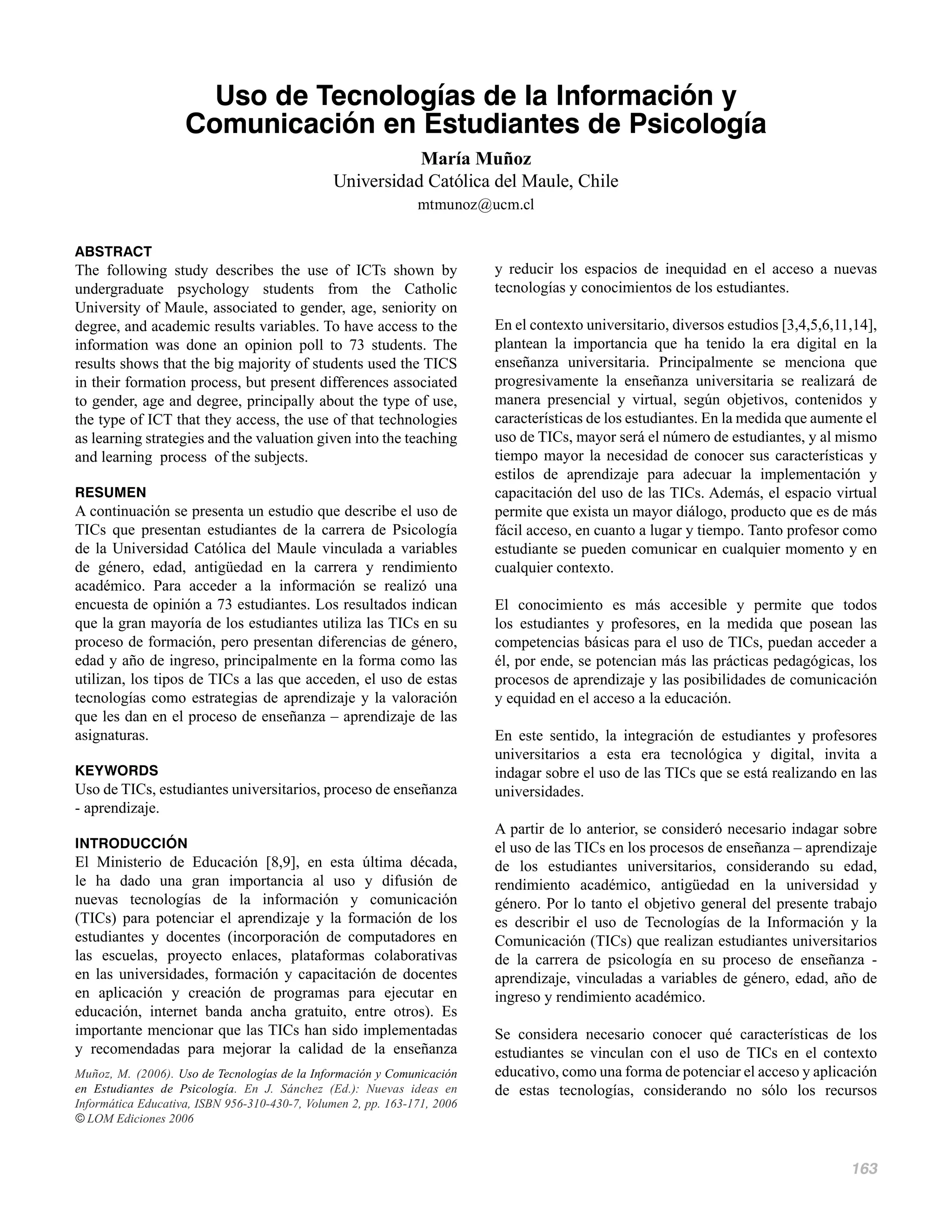 El estudio describe el uso de TIC por estudiantes de psicología en una universidad chilena y cómo está relacionado con variables como género, edad, año de ingreso y rendimiento académico. Se encuestó a 73 estudiantes sobre su uso de computadoras, internet, plataformas virtuales y correo electrónico. Los resultados mostraron que la mayoría usa TIC en su formación pero con diferencias según género, edad y año de ingreso, especialmente en cómo y qué TIC usan, y cómo valoran su uso en