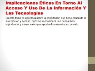 Este documento discute las implicaciones éticas del acceso y uso de la información y las tecnologías. Explica que el desarrollo tecnológico, especialmente Internet, ha facilitado el acceso a información de todo tipo y la comunicación inmediata entre personas. También describe algunas características clave del acceso a la información en la era digital y cómo la ética debe guiar el uso y difusión de contenidos en línea.