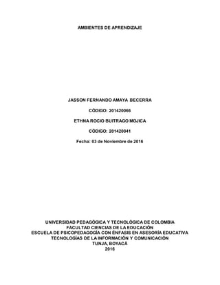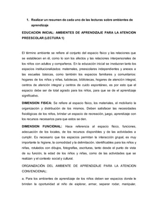 Este documento presenta resúmenes de tres lecturas sobre ambientes de aprendizaje. La primera lectura describe los diferentes tipos de ambientes de aprendizaje en la educación inicial, incluyendo las dimensiones física, funcional, temporal y relacional. La segunda lectura explica cómo generar ambientes de aprendizaje innovadores en el aula a través de la modernización de la práctica docente y el uso de tecnologías. La tercera lectura describe los componentes de los ambientes de aprendizaje a distancia como el entorno físico, el tiempo,