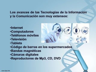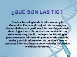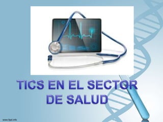 El documento discute el potencial de las tecnologías de la información y la comunicación (TIC) para mejorar la eficiencia y efectividad del sector salud. Menciona varias aplicaciones de las TIC como software médico, acceso a información para profesionales y pacientes, telemedicina, aplicaciones móviles, videoconferencia, sistemas de información geográfica y historias clínicas electrónicas. Concluye que las TIC han demostrado ayudar a mejorar la atención médica y prevención de enfermedades,