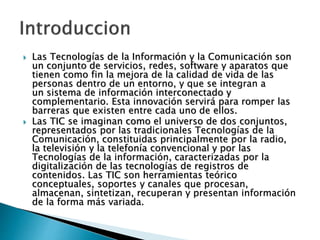 Las Tecnologías de la Información y la Comunicación (TIC) son un conjunto de servicios, redes y dispositivos que mejoran la calidad de vida al integrar un sistema de información interconectado. Las TIC se componen de las tecnologías de comunicación tradicionales como la radio y televisión, y las tecnologías de información caracterizadas por la digitalización. Las TIC procesan, almacenan, sintetizan e intercambian información de varias formas.