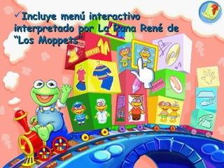 El documento describe un CD educativo interactivo para niños que incluye minijuegos para identificar partes del cuerpo, vestirse y reconocer profesiones, acompañado por la Rana René de Los Moppets. El CD favorece el desarrollo cognitivo y sensorial de los niños y les provee información sobre sí mismos y su cultura. Sus fortalezas son las actividades interactivas, aunque sus debilidades son la falta de diferenciación de género y pocas canciones educativas.
