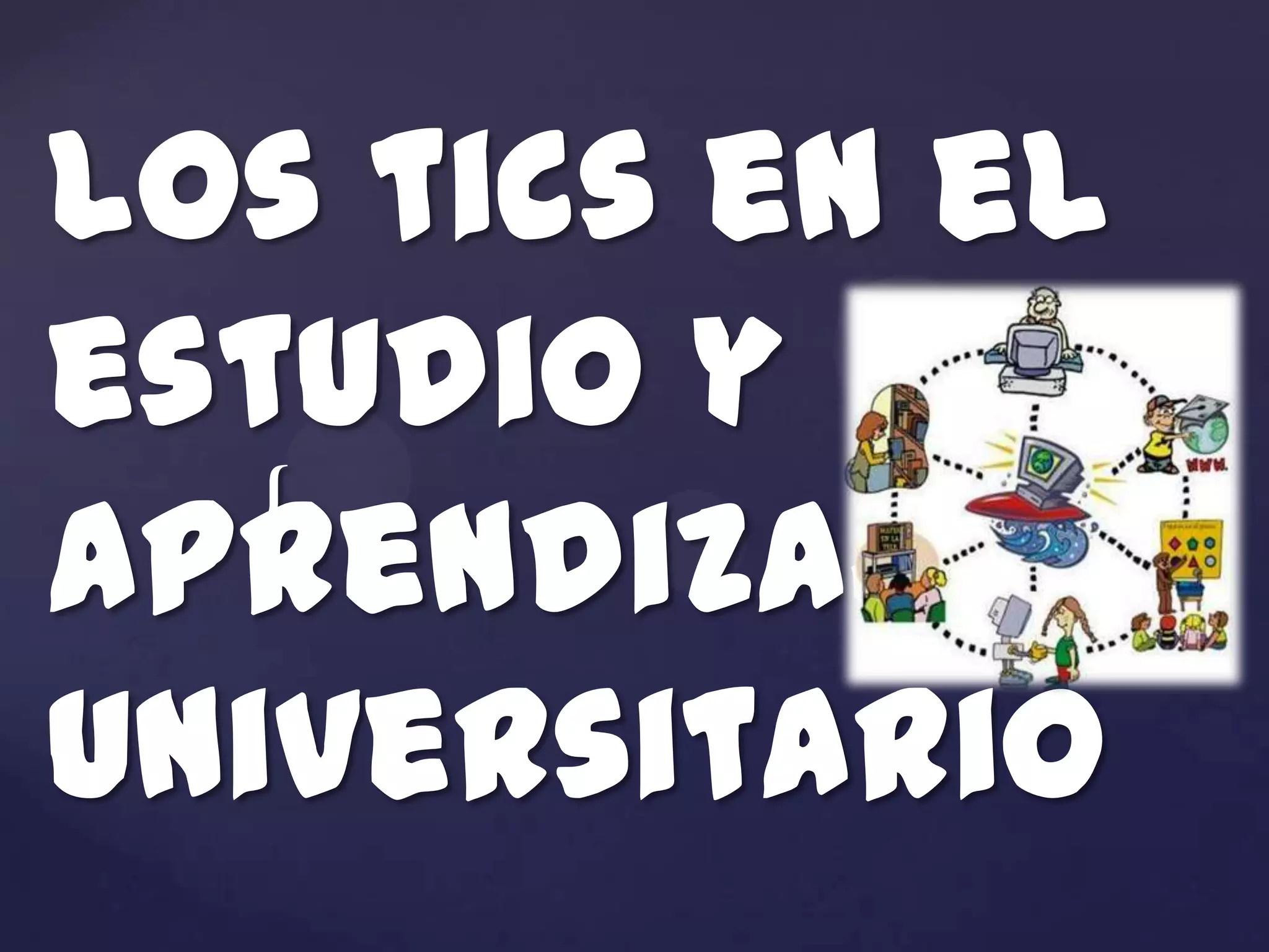 El documento describe las diferentes tecnologías de la información y la comunicación (TIC) que pueden usarse en el estudio y aprendizaje universitario. Explica TIC independientes de redes como hipertextos, hipermedia y multimedia, las cuales permiten vincular información de varios formatos. También describe TIC que se fundamentan en redes, como listas de distribución, teleconferencias, videoconferencias, aulas virtuales y campos virtuales, las cuales facilitan la interacción entre personas de diferentes ubicaciones. Finalmente, señala que las