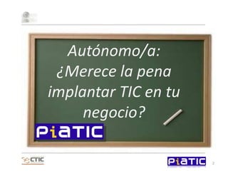Este documento presenta una simulación del impacto cuantitativo que podrían tener las TIC en un negocio autónomo tipo. Se asume un aumento medio de las ventas del 5,66% y una reducción de costes del 6,22% con la adopción de TIC. Esto podría generar un impacto global de 10.000 euros adicionales por año en ingresos. Además de los beneficios económicos, las TIC también podrían conllevar otros impactos positivos para el crecimiento del negocio que son más difíciles de