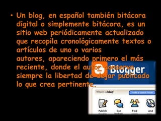 Un blog es un sitio web actualizado periódicamente que recopila artículos de uno o más autores de forma cronológica. Los blogs toman su nombre de los cuadernos de bitácora usados en barcos para registrar viajes. Aunque su popularidad ha crecido recientemente, los cuadernos de trabajo o bitácoras han existido por mucho tiempo.