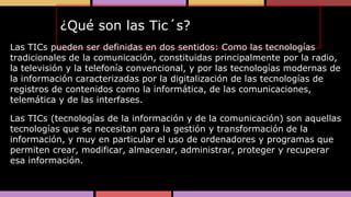 Las TICs pueden definirse como tecnologías tradicionales de comunicación como la radio y televisión, y tecnologías modernas de información digital como la computación e internet. Las TICs permiten crear, almacenar y gestionar información usando computadoras. La historia de las TICs incluye el telégrafo, teléfono, radio, televisión e internet. Actualmente, las TICs han revolucionado la sociedad a través de la globalización y comunicación inmediata.