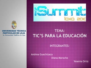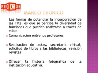 Las TIC pueden mejorar la educación permitiendo la comunicación entre profesores, realización de documentos virtuales y ofreciendo la historia de las instituciones educativas. La economía del conocimiento se basa en la producción e intercambio de ideas usando la tecnología. Las TIC enfrentan retos como mantener su expansión, prevenir la desigualdad social y requieren una educación innovadora. Su implementación en la educación requiere considerar aspectos organizativos como la formación de profesores y la presencia física de la tecnología.