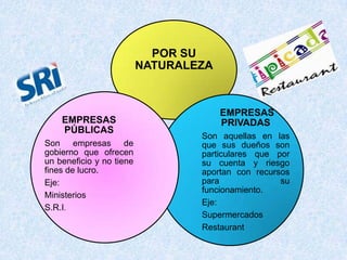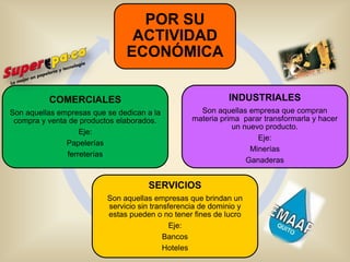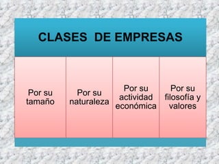 La empresa puede clasificarse de diferentes formas, incluyendo por su tamaño, como microempresas, pequeñas, medianas y grandes empresas, y también por su filosofía y valores, como empresas sociales, verdes u orientadas a objetivos. La empresa es una unidad económica organizada para producir bienes o servicios y generar beneficios.