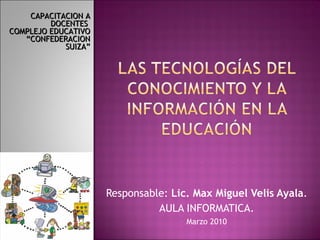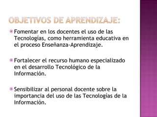 El documento describe un programa de capacitación en el uso de tecnologías de la información y la comunicación (TIC) para docentes, enfatizando la importancia de la formación continua y nuevas competencias tecnológicas. Se menciona la necesidad de adaptar y apropiar las TIC en el proceso educativo, fomentando habilidades de búsqueda, comunicación y trabajo colaborativo. Además, se aborda el concepto de educación virtual como un espacio de aprendizaje que trasciende lo presencial.