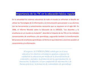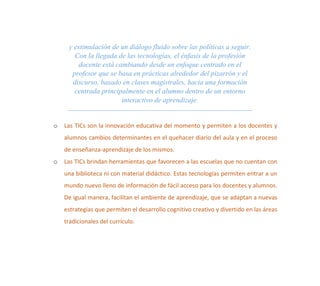 Las TICs son una innovación educativa importante que permite cambios significativos en el proceso de enseñanza-aprendizaje. Proporcionan herramientas que facilitan el acceso a información para docentes y estudiantes. Asimismo, fomentan un ambiente de aprendizaje más interactivo y creativo centrado en el estudiante.