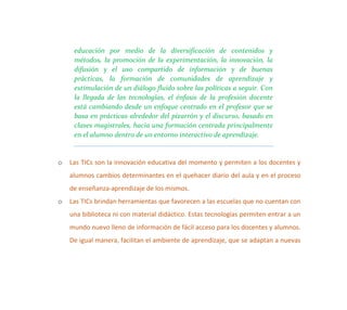 Las TICs juegan un papel importante en la educación básica regular al brindar nuevas herramientas para que docentes y estudiantes accedan a la información y mejoren los procesos de enseñanza y aprendizaje. Las TICs permiten diversificar los contenidos y métodos educativos, fomentar la innovación y compartir buenas prácticas. Asimismo, las principales funcionalidades de las TICs en la educación están relacionadas con la alfabetización digital, el uso personal y la gestión de centros educativos.