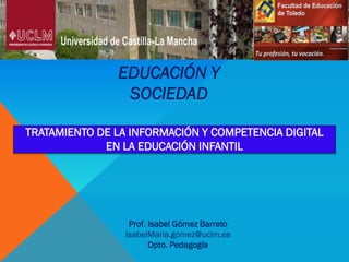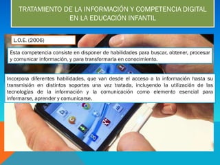 Este documento describe el tratamiento de la información y la competencia digital en la educación infantil. Explica que esta competencia implica habilidades como buscar, obtener y comunicar información usando tecnologías. También destaca la importancia de iniciar a los niños en el uso de herramientas digitales como ordenadores, tabletas y pizarras interactivas de forma lúdica para que aprendan y se comuniquen. Además, propone criterios como la creatividad, la atención a la diversidad y el aprendizaje colaborativo para gui