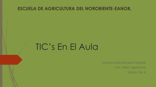 El documento habla sobre el uso de las Tecnologías de la Información y la Comunicación (TIC's) en el aula. Explica que las TIC's incluyen dispositivos, aplicaciones y software que facilitan la enseñanza y el aprendizaje. También describe cómo Internet, las redes sociales, los blogs y los repositorios pueden usarse como herramientas educativas.